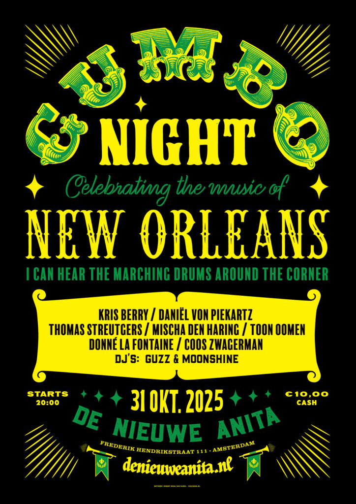 Join the Gumbo Night , the steamiest party in town at De Nieuwe Anita. Your favorite musicians laying it down, the dj’s spinning the greatest New Orleans nuggets on 45 and 78 rpm and of course you; Come and join us celebrate the music of New Orleans!