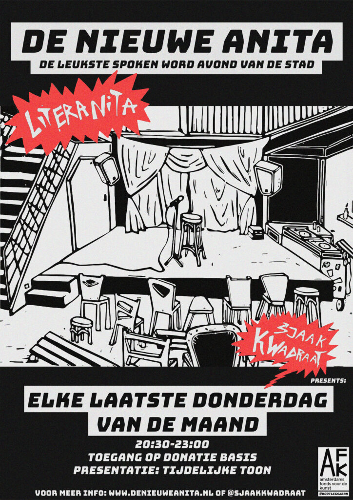 Sjaak Kwadraat brengt met Literanita elke laatste donderdag van de maand weer een nieuwe lading geprogrammeerde muziek, poëzie, spoken word, theater en performance naar de kelder van de nieuwe Anita.