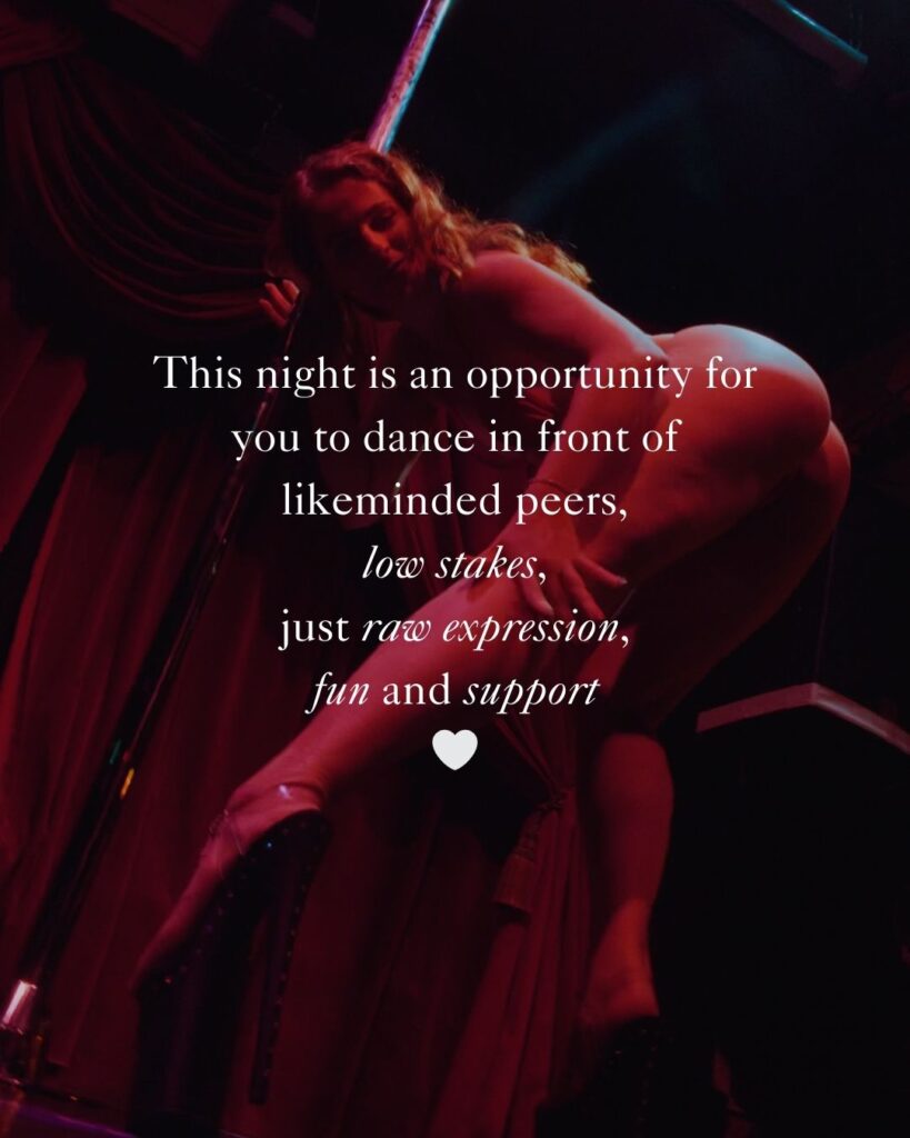 We will have a stage pole, but this night is for all dances: pole, floor, lap dance, strip tease, twerk, burlesque, erotic, and everything in between